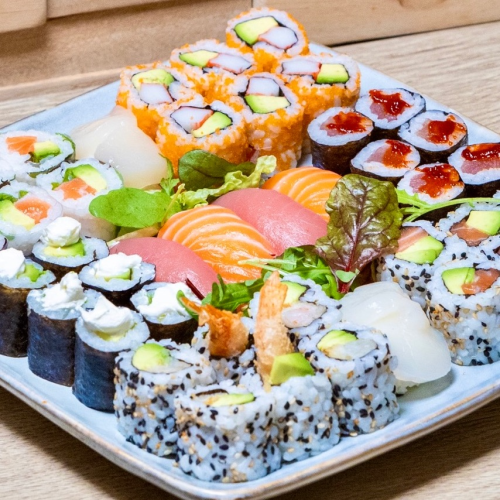 6 spring zalm, 6 California zalm avocado, 6 California surimi, 6 California scampi, 6 maki cheese avocado, 6 maki tonijn, 2 nigiri zalm, 2 nigiri tonijn, 2 nigiri St-Jacobs.