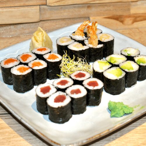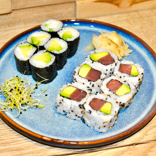 6 maki zalm, 6 maki tonijn en 6 maki cheese avocado.